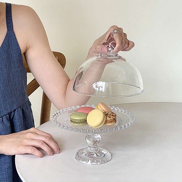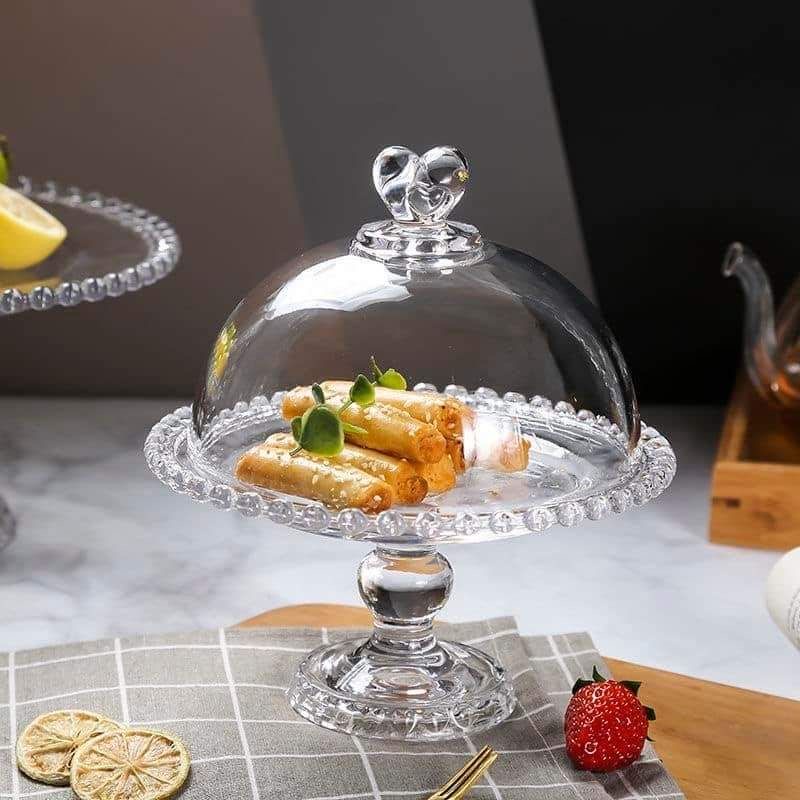 The round fruit stand with glass cover draws admiring eyes to your creation without overpowering it. The elegant yet sturdy footed glass and the glass cover with love-shaped desgin elevates your delicacy while the sparkling glass allows 360-degree views. The tray with its tall design for easy using,makes its exquisite appearance and the clear body matched with most kinds of food. Do not hesitate to buy it, it would be a special view at your dining table, and help you in serving.