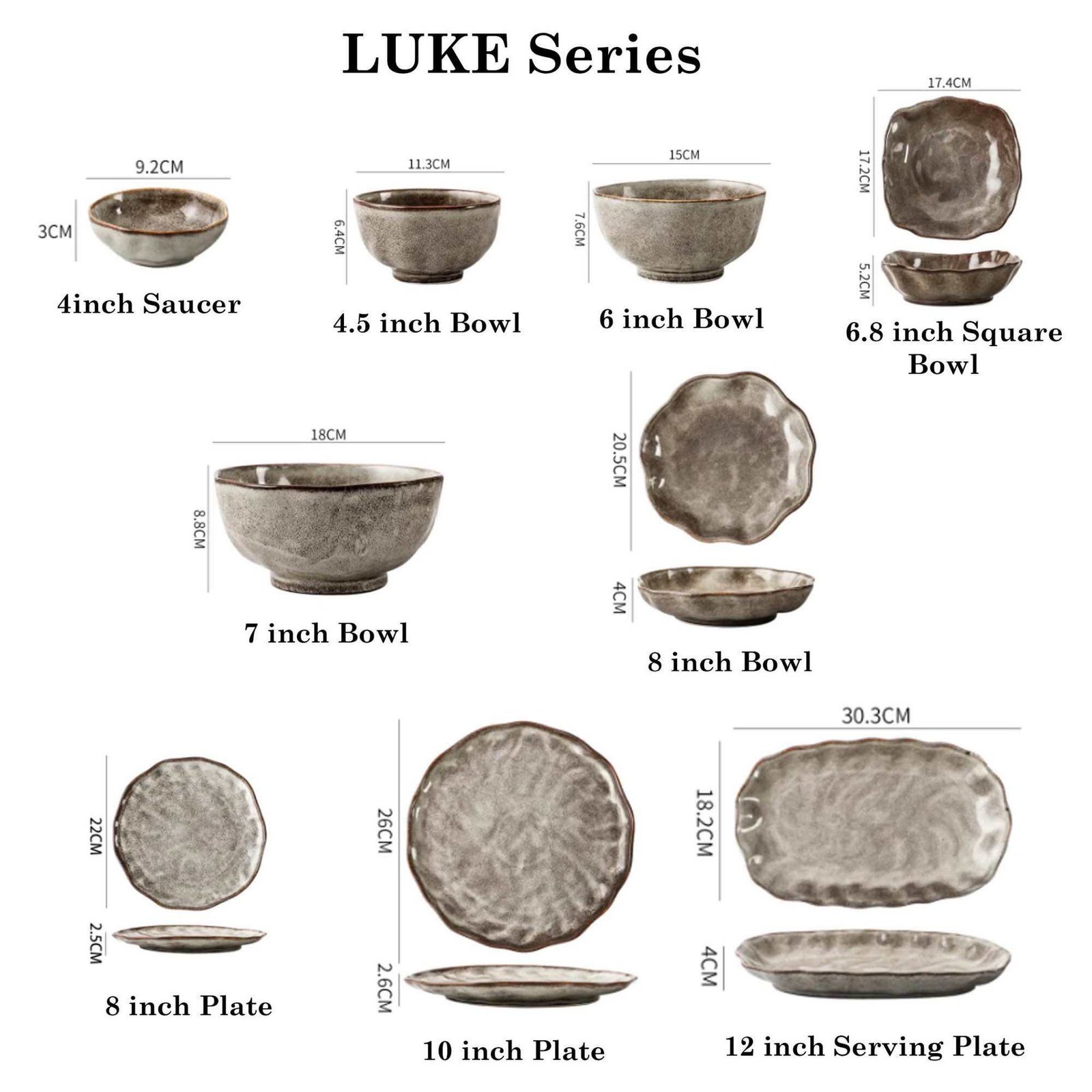 - Size: 4 inch Bowl, 6.8 inch Bowl, 12 icnh Serving Plate, 8 inch plate and 10 inch Plate